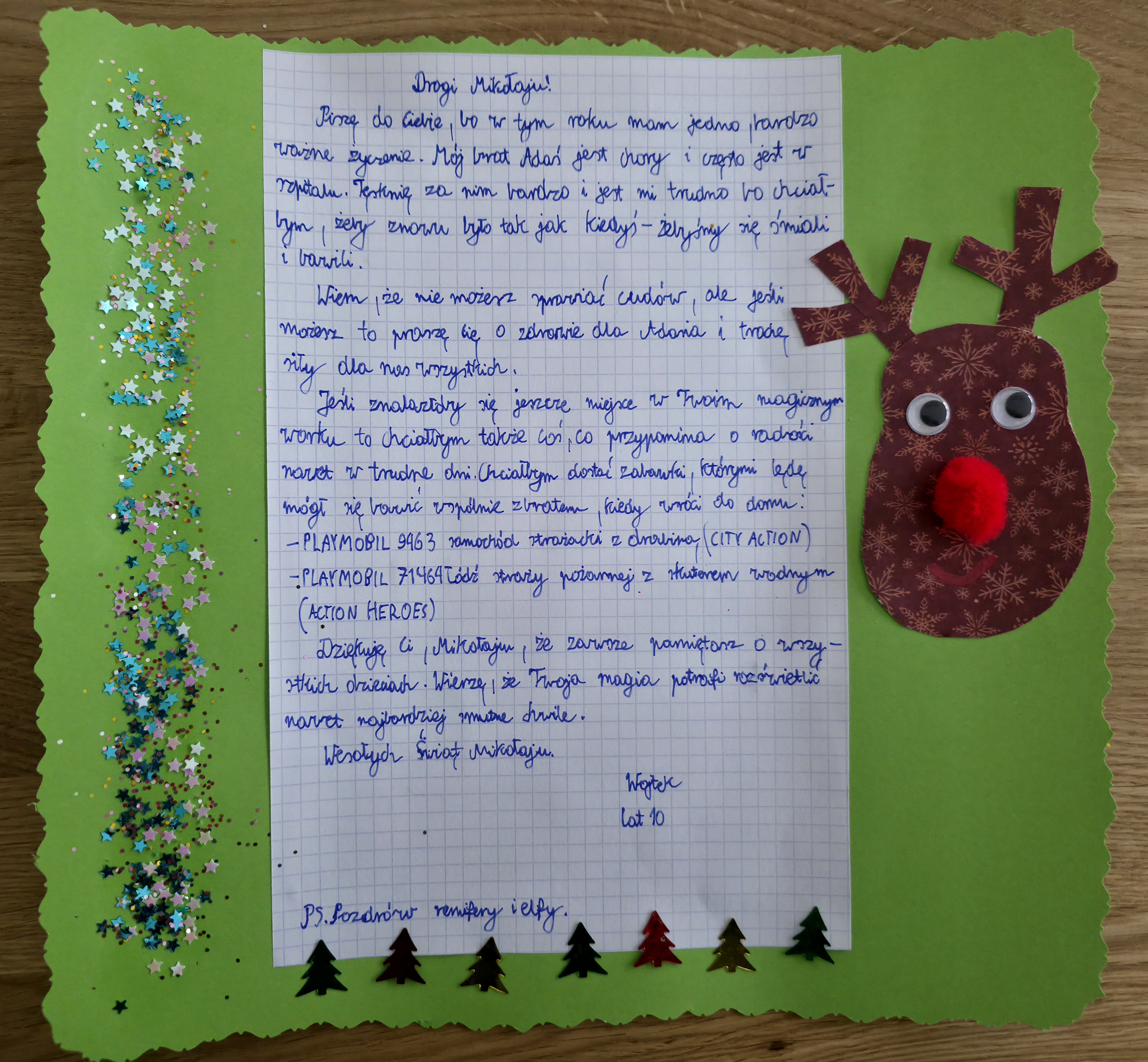 Brat Wojtka- Adaś ma zdiagnozowanego glejaka o wysokim stopniu złośliwości. Pod koniec sierpnia Adaś przeszedł operację wycięcia ponad 5 cm guza, następnie we wrześniu reoperację z powodu wycieku płynu mózgowo- rdzeniowego, w październiku chemioterapię we wlewach a aktualnie jest w trakcie 7 tygodniowego pobytu w szpitalu, gdzie przechodzi radioterapię i otrzymuje chemioterapię doustną. Jest to bardzo trudny czas dla obu chłopców, ponieważ są ze sobą bardzo związani emocjonalnie a Wojtek jest świadomy tego z jak trudną chorobą mierzy się jego brat. Wojtek jest dla Adasia największym wsparciem i każde ich spotkanie dodaje Adasiowi siły do dalszej walki. Dzięki Wojtkowi Adaś mimo braku apetytu spowodowanego leczeniem onkologicznym sięga po jedzenie, co w tym czasie ma ogromne znaczenie.