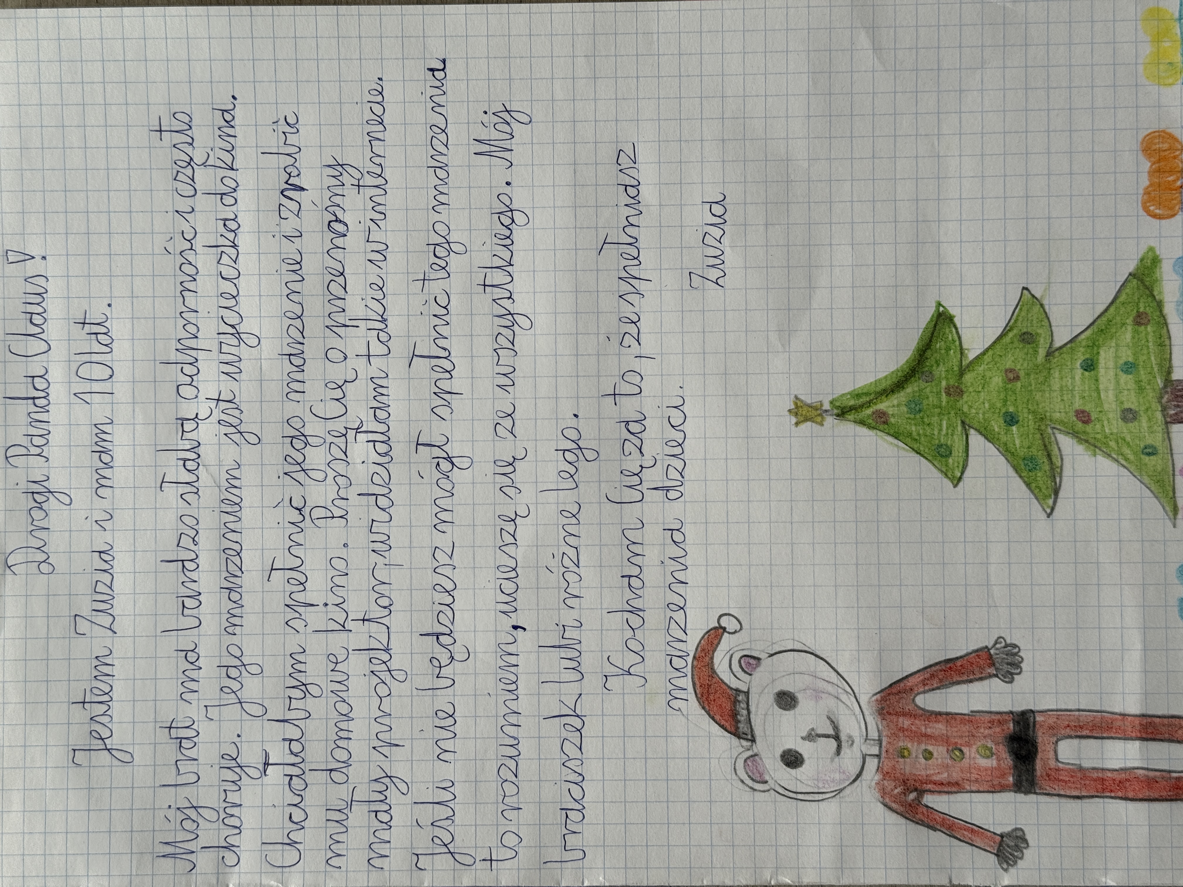 W 2022 roku usłyszeliśmy diagnozę ….ostra białaczka limfoblastyczną. Nasze życie odwróciło się do góry nogami. Jedno dziecko w szpitalu, drugie w domu bez mamy. Był to ciężki czas dla naszej rodziny. Syn jest ponad rok w remisji. Trzymamy się myśli, że musi być już tylko dobrze. Córka ucieszyła się, że może napisać list do Panda Claus, bo w tym liście to ona jest ważna.