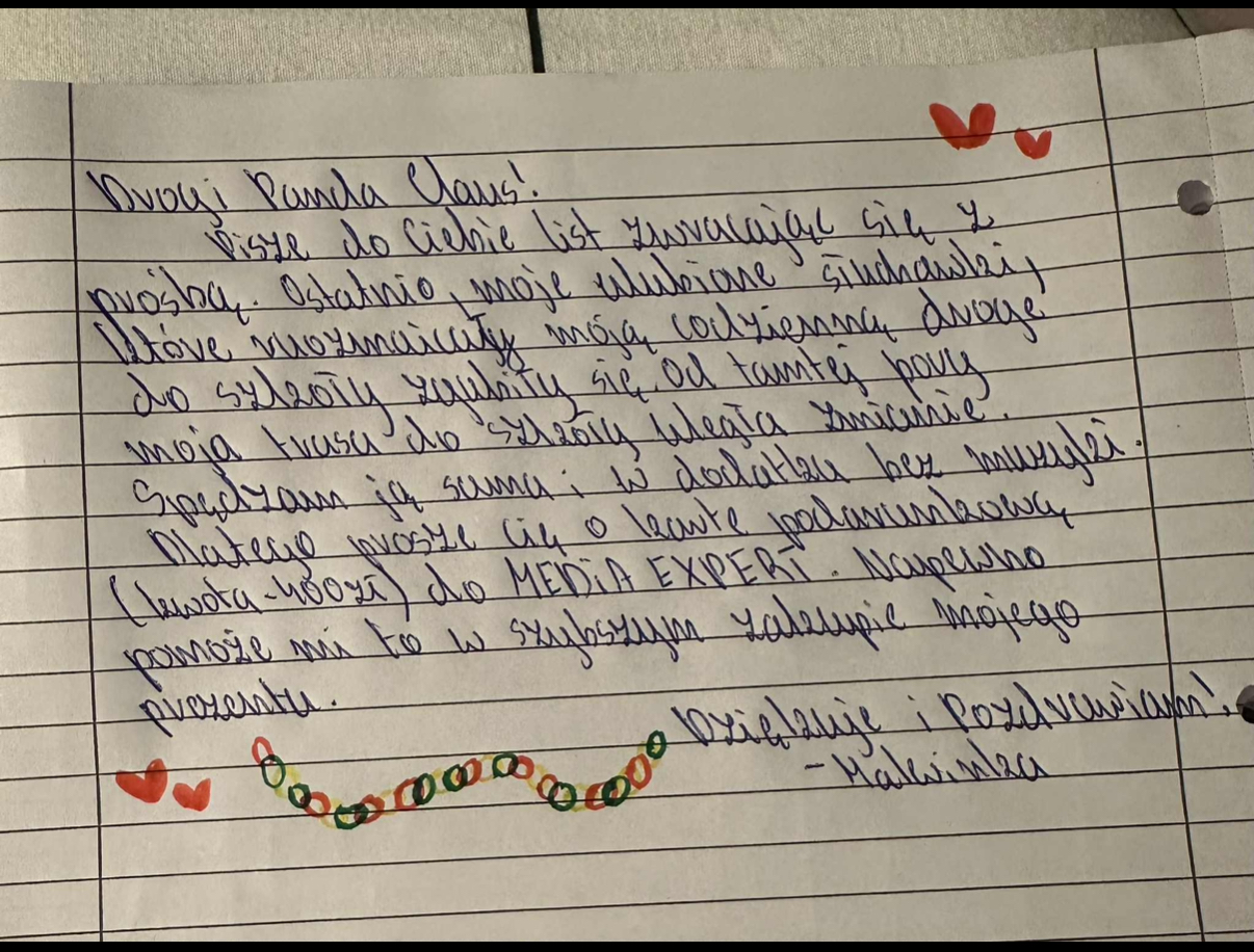 Nasza córka Hania zachorowała na neuroblastomę, gdy miała 3,5 roku. Choroba i leczenie zabrały nam wiele spokoju i beztroski. W tym czasie obok niej była Malwina — starsza siostra, która musiała szybko dorosnąć. To na jej barki spadło wiele obowiązków, niepokoju i tęsknoty, których nie powinna doświadczać tak młoda dziewczyna. Mimo to Malwina była przy Hani zawsze: wspierała ją, czekała, rezygnowała z własnych potrzeb. Chcemy, aby udział w akcji Panda Claus był dla niej chwilą piękna tylko dla niej — docenieniem jej dojrzałości, troski i ogromnego serca, które niosła przez całą chorobę siostry.