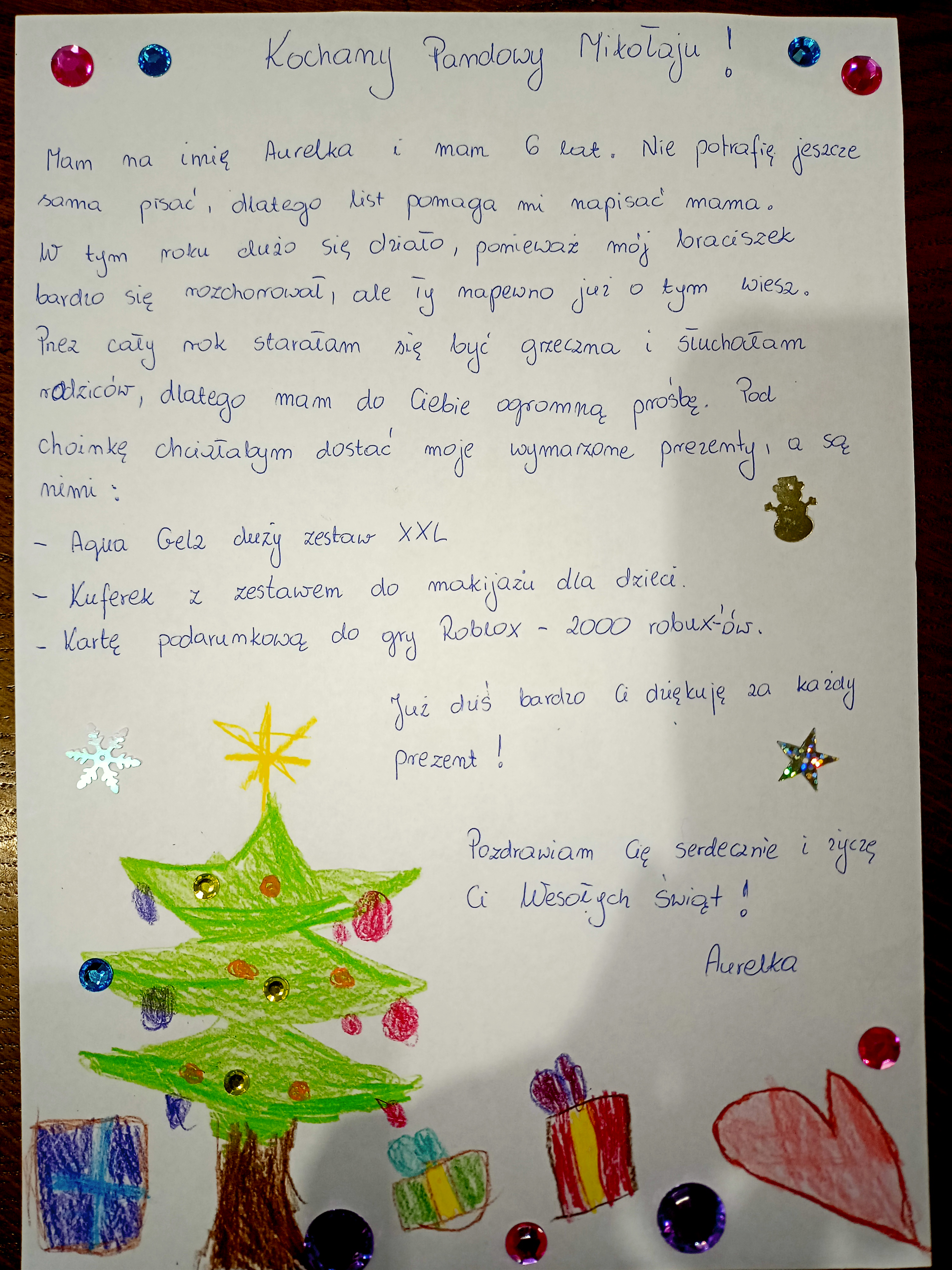 Nasza historia rozpoczęła się 19 stycznia 2023 roku, kiedy nasz najmłodszy syn, Jakub, zachorował na białaczkę limfoblastyczną typu T. Życie całej naszej rodziny odwróciło się o 180°, a dla rodzeństwa Kuby – sześcioletniej Aurelii i dziesięcioletniego Adama – był to niezwykle traumatyczny czas. W jednej chwili ich spokojne dzieciństwo zamieniło się w strach, niepewność i mocno ograniczony kontakt zarówno z rodzicami, jak i rówieśnikami. Dzieciom najtrudniej odnaleźć się w nowej, nieznanej i nieprzewidywalnej sytuacji. Nam, dorosłym, było ciężko się z tym pogodzić, a jednocześnie musieliśmy tłumaczyć wszystko dzieciom, starając się nie budzić w nich jeszcze większego lęku o życie najmłodszego braciszka. Najgorsze były pobyty Kuby w szpitalu i czas, kiedy jedno z nas – ja lub mąż – musieliśmy być z nim przez cały czas. Aurelia i Adam nie rozumieli, dlaczego muszą „dzielić się” rodzicami, skoro ich koledzy i koleżanki mają mamę i tatę codziennie w domu. Szczególnie trudne były rodzinne uroczystości, święta i urodziny, które często musiały wyglądać inaczej niż dotychczas. Dzięki wzajemnemu wsparciu i pomocy wielu osób – często zupełnie nam nieznanych – udało nam się przetrwać, miejmy nadzieję, najgorszy czas i dotrwać do dnia dzisiejszego. Zdecydowaliśmy się wziąć udział w tej akcji, ponieważ chcemy, aby nasze dzieci poczuły, że one także są ważne, choć ostatnio żyją jakby w cieniu swojego najmłodszego, chorego braciszka. To właśnie jego zdrowiu podporządkowane jest obecnie całe nasze życie: wszystkie wyjazdy, wyjścia czy liczne wizyty u specjalistów. Razem z mężem bardzo chcielibyśmy, aby Adaś i Aurelka otrzymali od Mikołaja swoje wymarzone prezenty. Chcemy, by poczuli radość i wyjątkowość, na które tak bardzo zasługują.