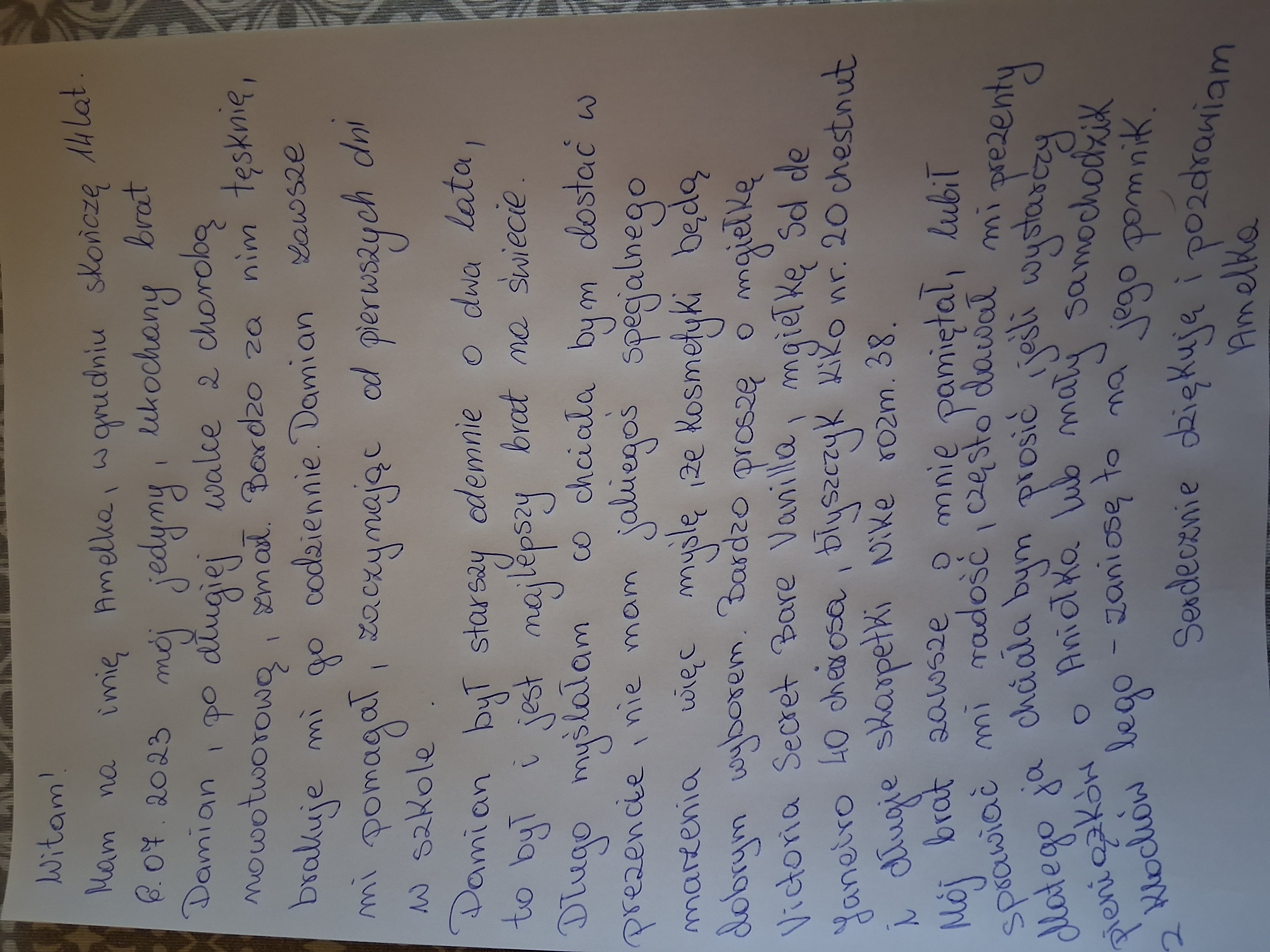 Dzień dobry mam na imie Sylwia. Jestem mamą Amelki i cudownego aniołka Damianka,nasz ukochany syn i brat po czternastu miesiącach walki z nierównym przeciwnikiem jakim jest nowotwór zdjął zbroje i założył niebiańskie skrzydełka.Wszyscy bardzo cierpimy i nie potrafimy pogodzić się z jego odejściem.Damianek był wyjątkowym nastolatkiem,zawsze chętny do pomocy,zawsze uśmiechnięty.Bardzo nas kochał.Amelka i Damianek byli bardzo zgranym rodzeństwem,zawsze dbali o siebie na wzajem. Amelka bardzo przeżyła chorobę a potem odejście brata i bardzo szybko musiała dorosnąć, widzę jak cierpi. Z uśmiechniętej i szalonej nastolatki stała się bardzo smutna, widzę jak często płacze. Staramy się, jakoś,,żyć ale tęsknota i ból jest straszna, nie da się tego opisać. Bardzo dziękuję że dzięki Wam na chwilę pojawi się uśmiech u naszej Córki.