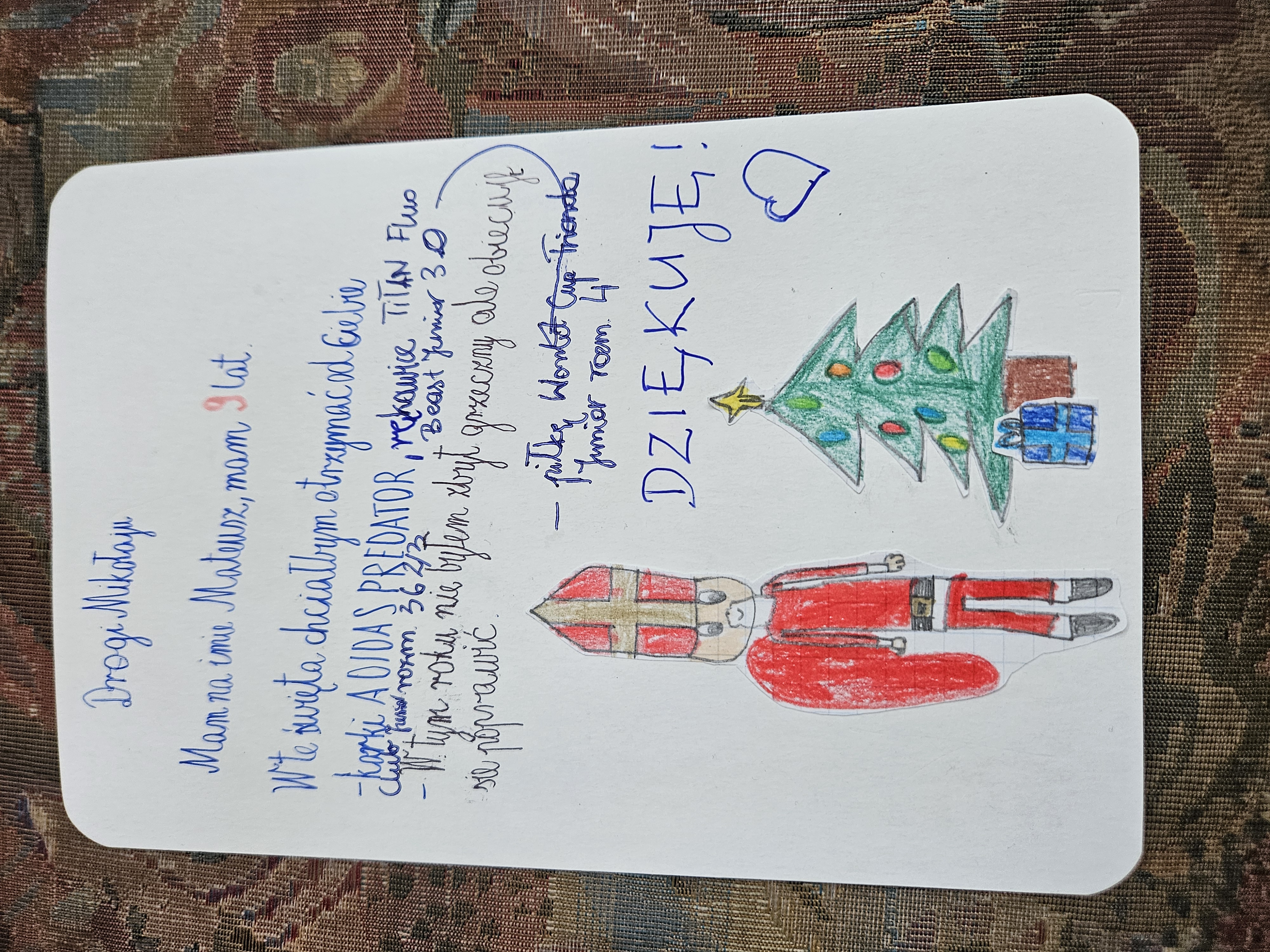 1. Korki adidas Predator Club FG/MG Junior - Biały (JH8868) rozm. 36 2/3 https://www.r-gol.com/korki-adidas-predator-club-fg-mg-junior-bialy,p-206982 2. Titan Juniorskie rękawice bramkarskie Fluo Beast Junior 3.0 https://www.decathlon.pl/p/mp/t1tan/juniorskie-rekawice-bramkarskie-fluo-beast-junior-3-0/_/R-p-3392b93f-9f09-4a8c-9db4-7ba107381dc9?mc=3392b93f-9f09-4a8c-9db4-7ba107381dc9_c1.c9&c=Czarny 3. Piłka nożna adidas World Cup 26 Trionda League Junior 350 lub 290 rozmiar 4 https://www.decathlon.pl/p/mp/adidas/pilka-fifa-world-cup-26-trionda-league-junior-350/_/R-p-70747334-d234-4d52-a28a-4cae891587f0?mc=70747334-d234-4d52-a28a-4cae891587f0_c4c218c5 https://www.decathlon.pl/p/mp/adidas/pilka-fifa-world-cup-26-trionda-league-junior-290/_/R-p-e1118af2-ab2d-424a-894d-b46f2dded17c?mc=e1118af2-ab2d-424a-894d-b46f2dded17c_c4c218c5