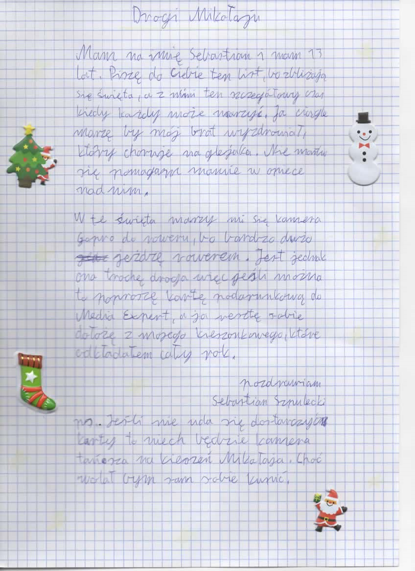 Bardzo duzo jezdze na roweze, dlatego dla mojego bezpieczenstwa mazy mi sie kamera sportowa gopro Hero ,4k z Wi fi i Bluetooth, ale kosztuje 800 zł . dlatego prosze cie o karte podarunkowa do Media Expert, a ja reszte sobie dołoze do tego prezentu , udało mi sie juz uzbierac 450 zł jesli nie mozesz podarowac mi karty to niech bedzie kamera, oczywiscie tansza niz ja sobie wymażyłem by starczyło Ci pieniedzy na wszystkie prezety bktore w tym roku robisz.pozdrawiam Sebastian Szpulecki