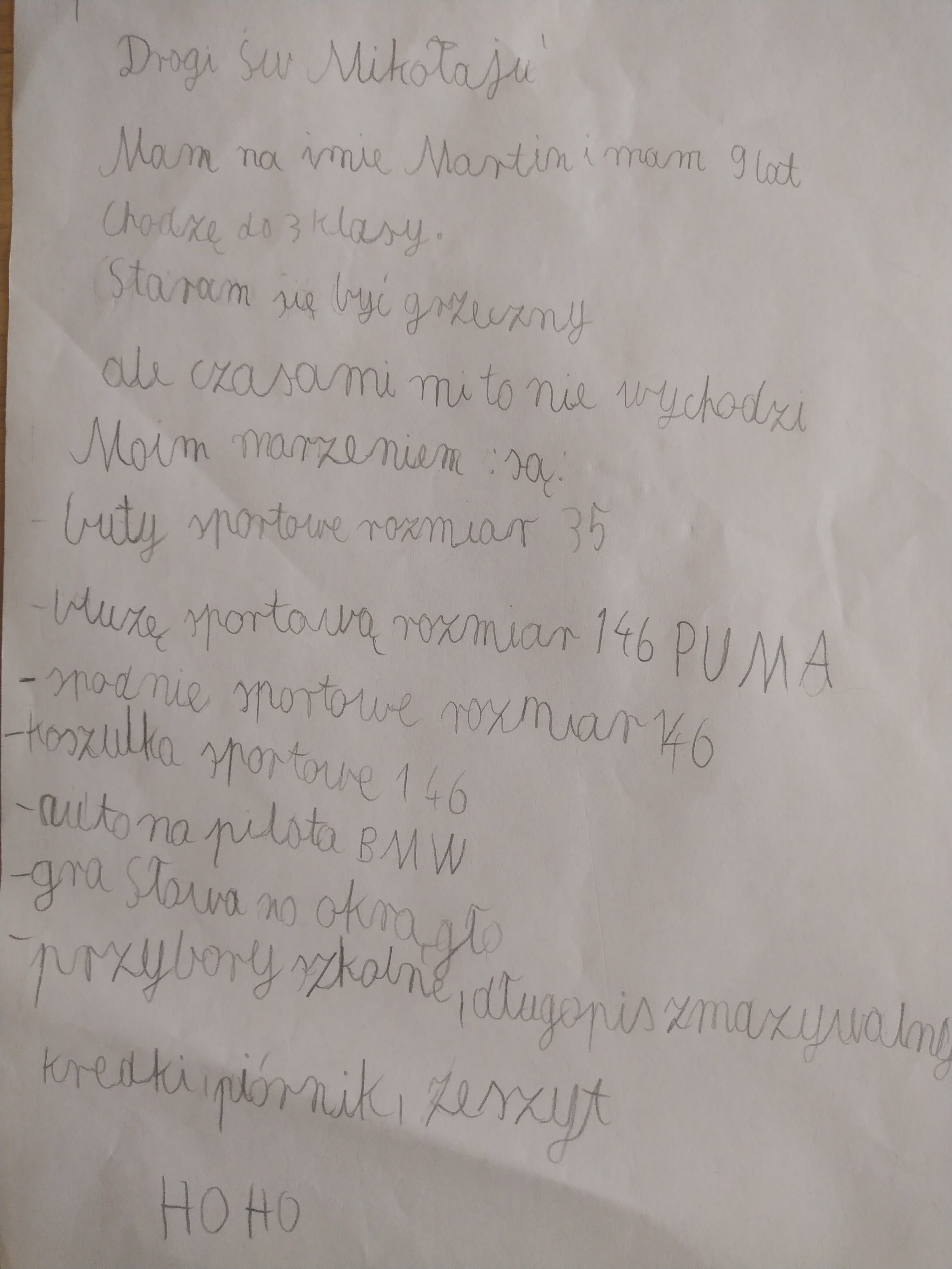 - buty sportowe rozmiar 35 - bluza sportowa rozmiar 146 PUMA - spodnie sportowe rozmiar 146 - koszulka sportowa rozmiar 146 - auto na pilota BMW - gra Słowa na okrągło - przybory szkolne (długopis zmazywalny, kredki, piórnik, zeszyty)