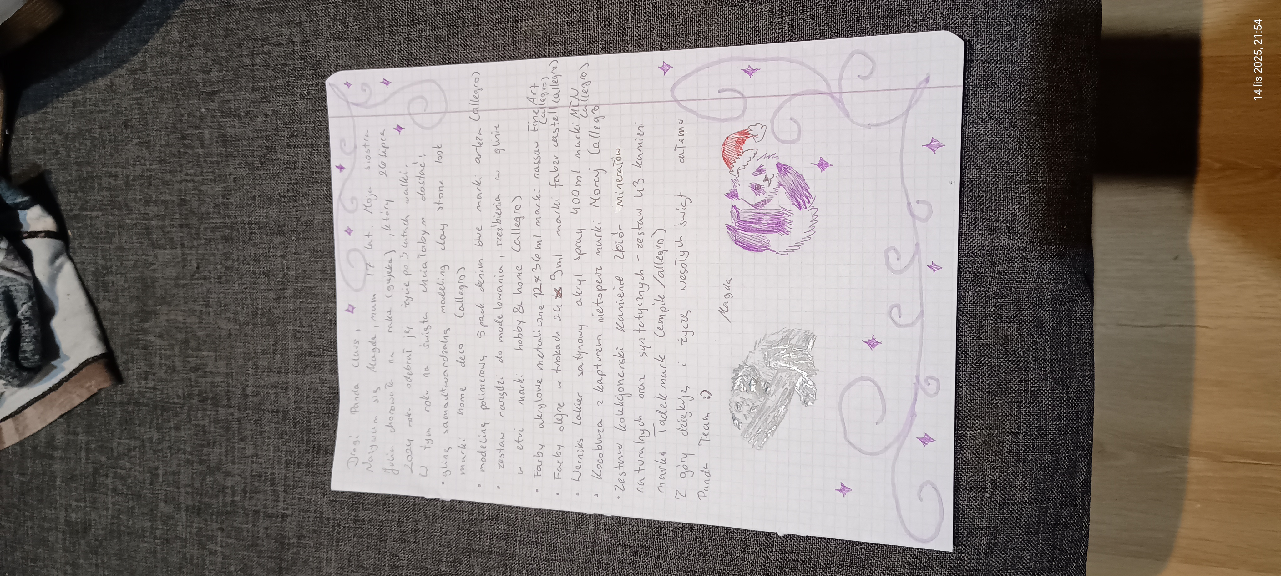 Droga ekipo Panda Claus. Moja najstarsza córka Julia w 2021 roku otrzymała diagnozę raka mózgu. Dzielnie z nim walczyła mimo powikłań, chemioterapii i protonoterapii. W 2023 roku trafiła pod opiekę hospicjum domowego Świetlikowo. Niestety 26 lipca 2024 roku po cichutku sobie zasnęła - biorąc głęboki oddech, umarła. Bardzo za nią tęsknimy. Codziennie o niej myślę. Wraz z 3 dzieci próbujemy żyć dalej, próbujemy się uśmiechać, dla niej. Korzystam z akcji aby choć trochę umilić dzieciom świąteczny czas i tęsknotę za siostrą. Wszystkim zaangażowanym z serca dziękujemy i życzymy wesołych świąt.